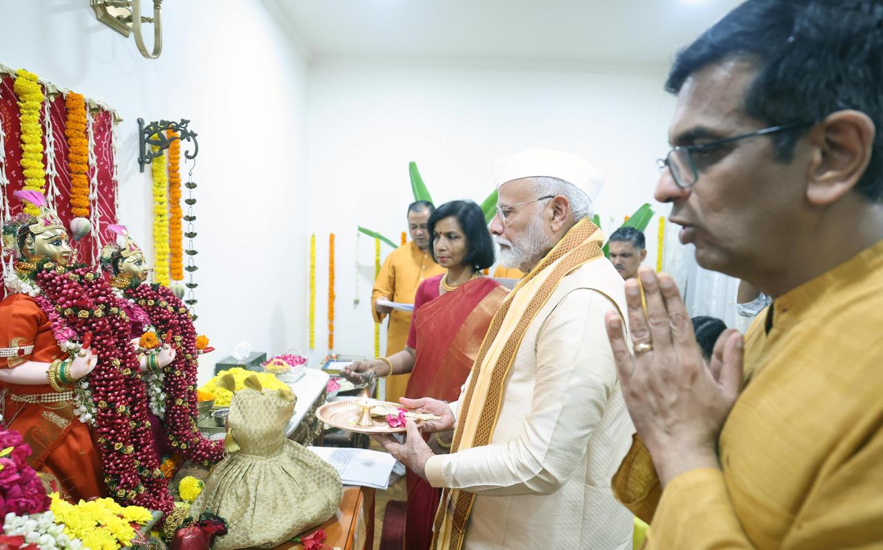 नई दिल्ली स्थित भारत के चीफ जस्टिस डीवाई चंद्रचूड़ के घर पर गणपति पूजा समारोह में शामिल हुए नरेंद्र मोदी इस दौरान पीएम मोदी सीजेआई डीवाई चंद्रचूड़ और उनकी पत्नी के साथ भगवान गणेश की आरती करते और पूजा करते नजर आए. मुख्य न्यायाधीश के आवास पर समारोह के दौरान प्रधानमंत्री ने पारंपरिक महाराष्ट्रियन टोपी पहनी हुई थी.इस पूरे कार्यक्रम की तस्वीरे सोशल मीडिया में सामने आई है. जिसमें देखा जा सकता है कि पीएम मोदी गणपति पूजा में हिस्सा ले रहे हैं. इस दौरान पीएम मोदी का सीजेआई चंद्रचूड़ और उनकी पत्नी ने स्वागत किया. बाद में प्रधानमंत्री ने गणपति की आरती की इस दौरान भी सीजेआई और उनकी पत्नी कल्पना दास चंद्रचूड़ भी पीएम मोदी के साथ पूजा स्थल पर मौजूद थी.